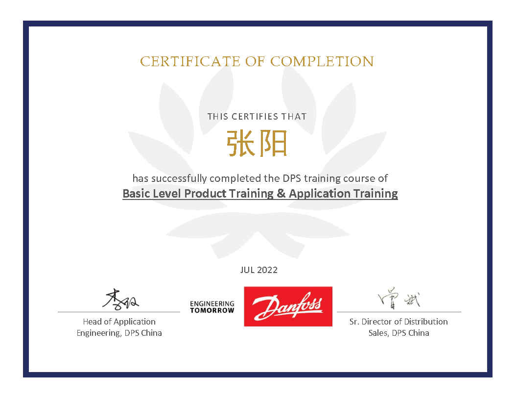 2022年6月底,Danfoss分銷商培訓--產(chǎn)品基礎知識及應用系統(tǒng)解決方案結(jié)束,我司參訓學員全部通過 ,并獲得認證證書!
